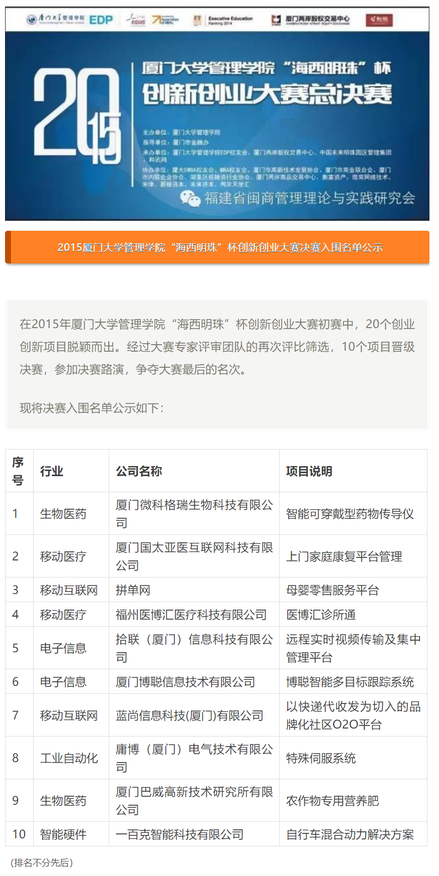 【公示】2015厦门大学管理学院“海西明珠”杯创新创业大赛决赛入围名单公示